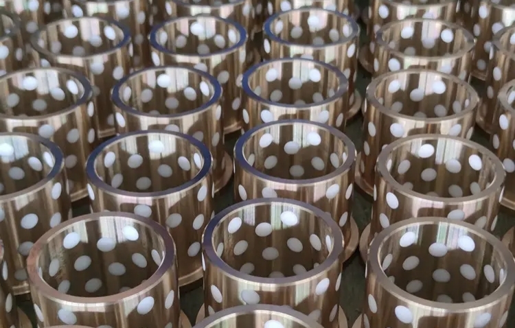 - Structura: Găuri găurite pe matricea de bronz cu acoperire a suprafeței ≤30%, coloane din PTFE presate, formând configurația „ungere solidă cu sarcină metalică”